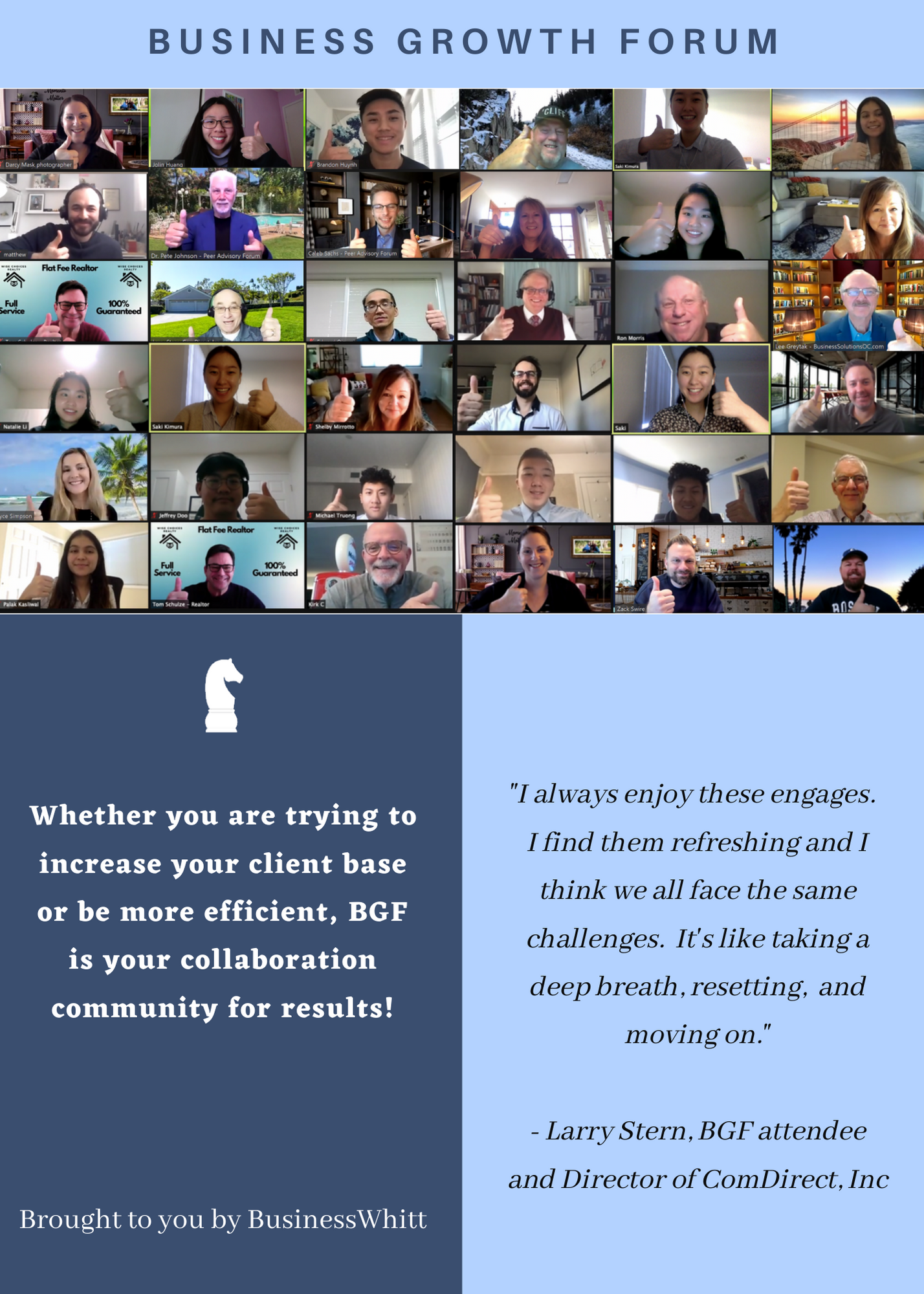The Business Growth Forum is your exclusive opportunity to connect with like-minded business professionals, a certified business coach, and a highly trained support team to identify ideas, plans, and strategies to grow your business faster and more efficiently.
